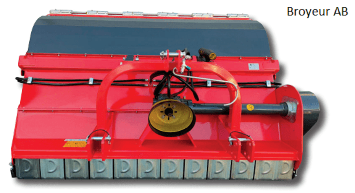 - 1 - Broyeur AB pour champs, vignoble, verger, parc. Avec bac de récolte à ouverture et fermeture hydraulique pour la collecte, adapté à l’herbe et aux brindilles. De 14 à 30 marteaux selon le modèle. Attelage arrière, rouleau arrière réglable avec racleur. Roue libre dans le boîtier, un contre couteau, Largeur de travail de 1,3 m à 2,8 m.