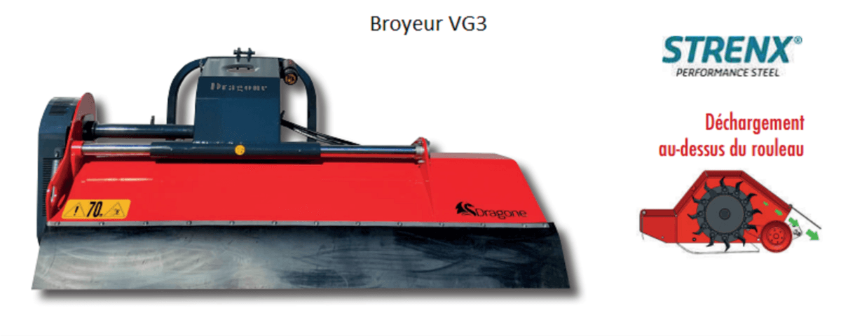 - 3 - Broyeurs VG1 , VG2 et VG3 (ce modèle en STRENX®) adaptés aux sols humides. Ventilation refroidissement courroies, patins renforcés, protection arrière en caoutchouc, flanc droit arrondi et sans saillies, contre couteau embouti, tige galvanisée, cloison arrière en caoutchouc. Rouleau arrière avec racleur. Capacité de coupe jusqu’à 8 cm. Déchargement au-dessus du rouleau. Largeur de travail de 1,2 m à 2,8 m sur les modèles VG1 et VGS et de 2,2 m à 3,2 m sur le modèle VG3. Choix d’équipements en option.