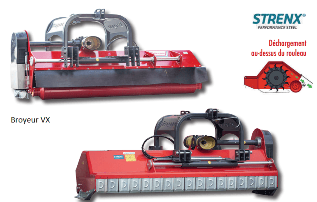 - 4 - Broyeur VX en STRENX® adapté. Rotor avec 2 spirales couteaux + 2 spirales marteaux pour le broyage de gros volumes de matériaux à grande vitesse. Attelage rouleau arrière réglable, boitier avec roue libre, attelage réversible, racleur rouleau arrière, protection arrière en caoutchouc, tige galvanisée. Largeur de travail de 2,8 m à 3,2 m. Déchargement au-dessus du rouleau. Choix d’équipements en option.