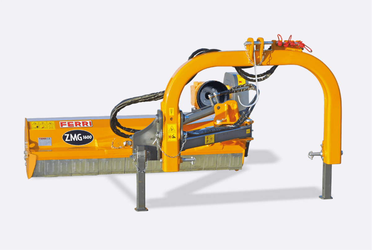 1 - Les broyeurs d’accotements ZMG avec boitier interne et les ZMGE avec boitier externe de la gamme Espaces Verts de chez Ferri, sont idéals pour l’entretien des bordures de parcelles, des fossés, des zones enherbées, broussailles, sarments, bois jusqu’à 4 cm. Rotor hélicoïdal à 6 rangées. Châssis oscillant qui permet de suivre les dénivelés du terrain. Inclinaison tète de broyage -48° / 90°. Puissance tracteur nécessaire 40 à 70 cv. Ces broyeurs peuvent être équipés d’un rotor à marteaux ou d’un rotor à couteaux polyvalents.