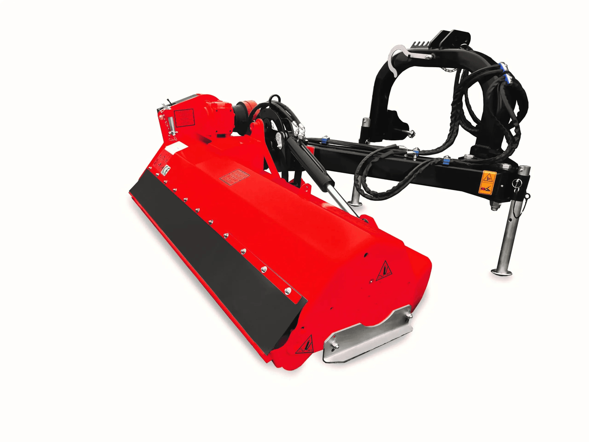 . Attelage 3 points cat. 2, boîtier fonte 540 tours avec roue libre, orientation hydraulique de la tête de broyage +90° -50°,denture marteaux montée sur boulon, déport 55 cm de l’axe du tracteur, rouleau arrière réglable, tendeur automatique de courroies, graissage centralisé, patins latéraux réglables, sécurité mécanique sur l’attelage, accumulateur oléopneumatique (boule d’azote), 4 courroies, cardan simple homocinétique