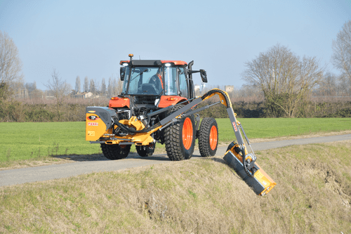 Portée horizontale : 4,82 m. Pièces d'articulation estampées moulées. Axes traités montés sur bagues bi-métal. Système anti basculement. Suspension oléopneumatique. Pivot arrière 115°. Groupe de broyage 1,25 m TNIT avec entraînement par courroies, équipé de couteaux polyvalents. Refroidisseur d'huile de série. Commande électronique progressive EG-Tronic avec gestion électrique du rotor.