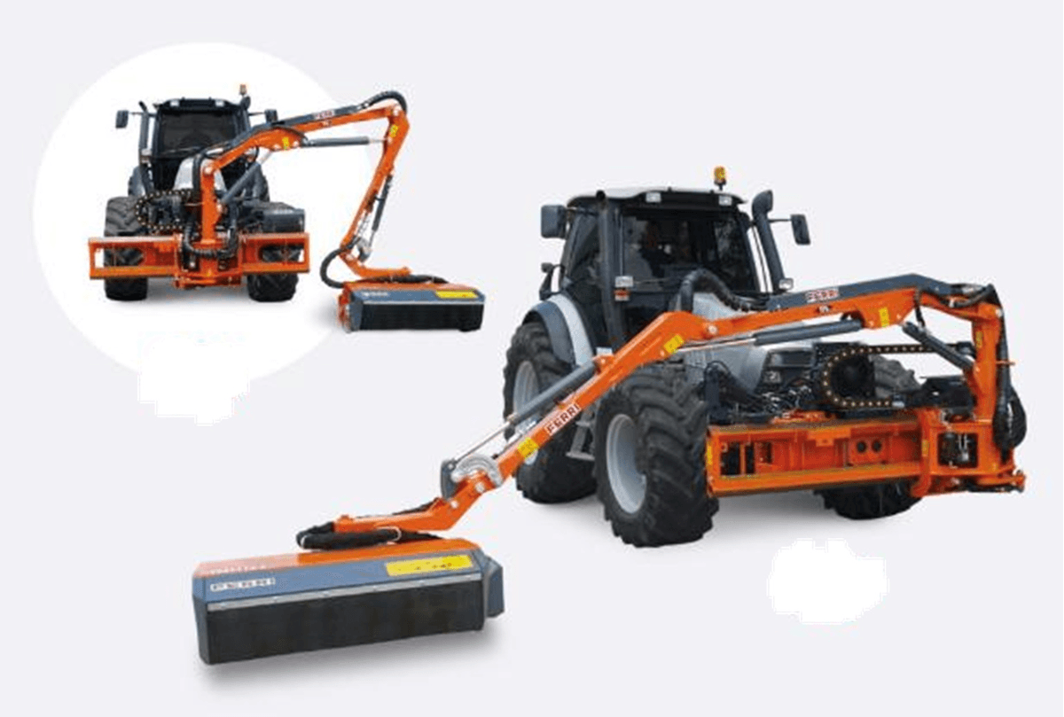 1 - Epareuse frontale hydraulique TST principalement adaptée à l’entretien des bords de routes et des communes. Le second bras est pourvu d’un dispositif de sécurité hydraulique et d’un système anti-basculement automatique. Portée horizontale de 5 m. Commande électrique à double vitesses (DS-Tronic Dual).