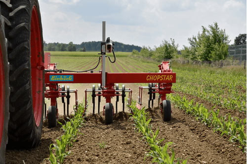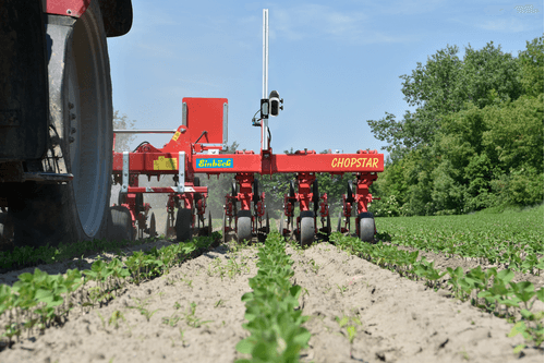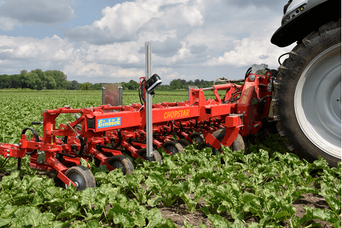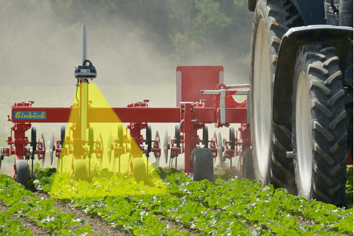 Interface s’attelant entre le tracteur et la bineuse ayant une course latérale de 500 mm. Caméra munie de 2 lentilles. Visualisation 3D avec sélection de la vision des couleurs. Détection des différentes structures de rangs : ligne de culture et rang multiple.