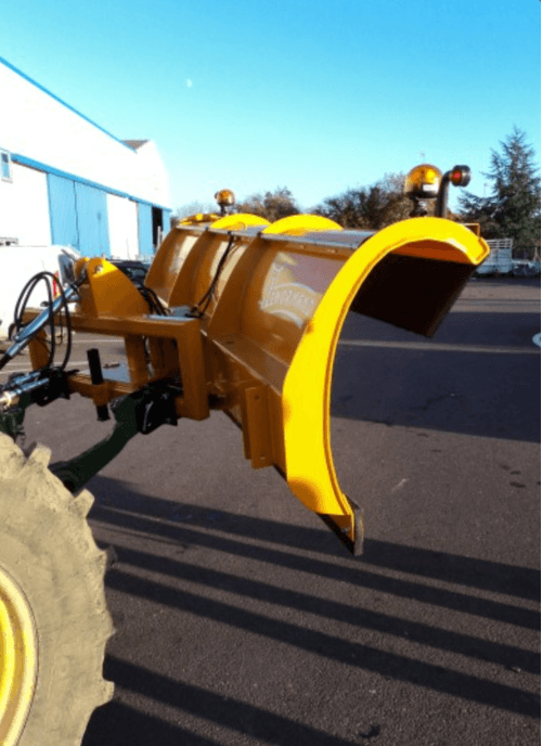 Lames de déneigement avec renforts dorsaux et caoutchouc 40mm spécial neige. Attelage relevage. Feux de gabarits et plaques de signalisation .