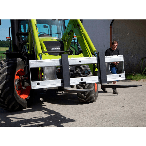 Avec 5 douilles coniques soudées pour un transport parfait des balles rondes. Le rail de guidage fraisé en biais selon la norme ISO 2328 permet un réglage facile, simple et rapide de la fourche (pas de blocage !). Broches pour fourche à palette spécialement forgées (900 ou 1 200 mm) avec ajustement par ressorts et fermeture à cliquet sécurisée (pour garantir l'encliquetage des fourches).