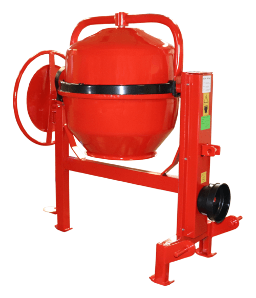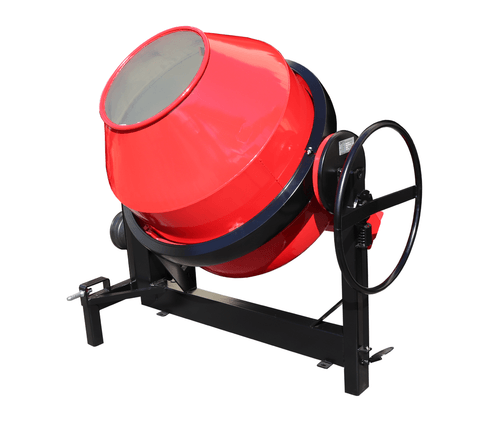 Gamme de bétonnières agricoles à basculement latéral par volant, pour micro-tracteur ou tracteur allant de 180 à 430L, avec 2 à 3 pâles de malaxage.