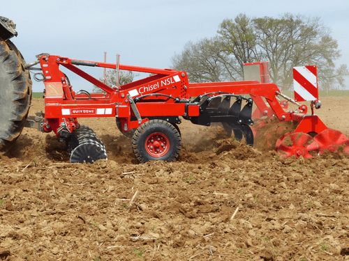 2 - Le déchaumeur à dents porté CHISEL NSL avec châssis bipoutre ou tripoutre 100 x 100 mm avec 2 ou 3 rangées de dents non-stop à lames avec pointe type charrue réversible, dégagement sous châssis 830 mm.