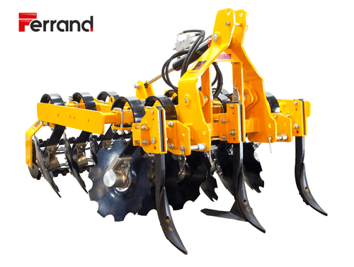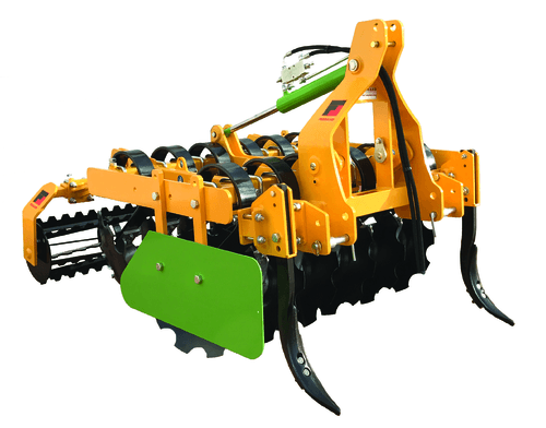 Ces déchaumeurs à disques Discosol ont une largeur de travail de 1,50 m à 3 m en fonction du modèle. Avec relevage fixe ou hydraulique, sécurité par ressort à lame, rouleau cranté Ø 360 mm, disques Ø 510 mm, attelage cat. 2, châssis 80 x 80 x 8 mm. La configuration des disques en V ou en X en fonction du modèle Discosol V ou Discosol X. Dent centrale sur le modèle Discosol X. Le nombre de disque varie en fonction du modèle de 8 à 20 disques. Palier à rouleaux coniques sans entretien.