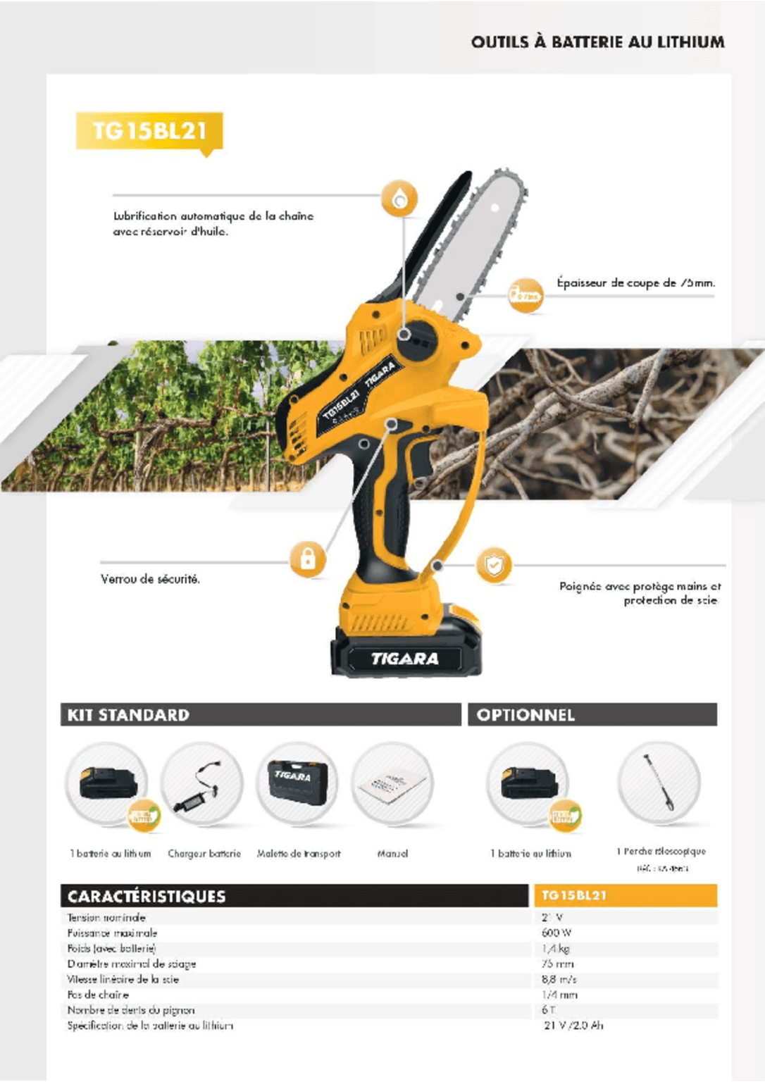 Malette de transport, 1 batterie au lithium 2 Ah 21 V, 1 chargeur de batterie.