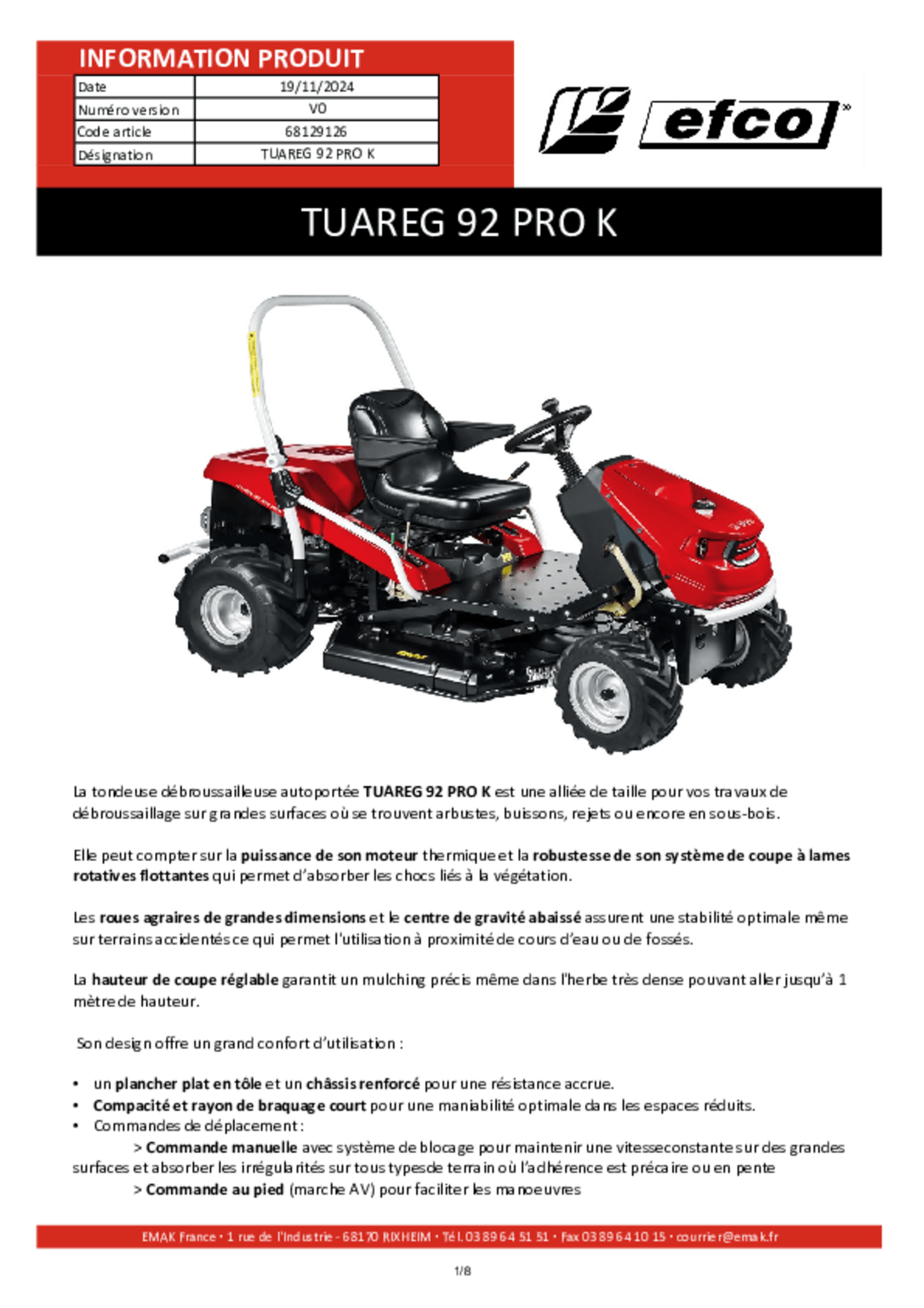| Moteur | Emak K2400 AVD V TWIN |