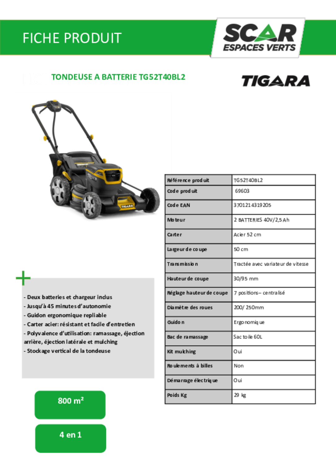 Livrée avec 2 batteries 2,5 AH Li-ion 40 V et 1 chargeur.