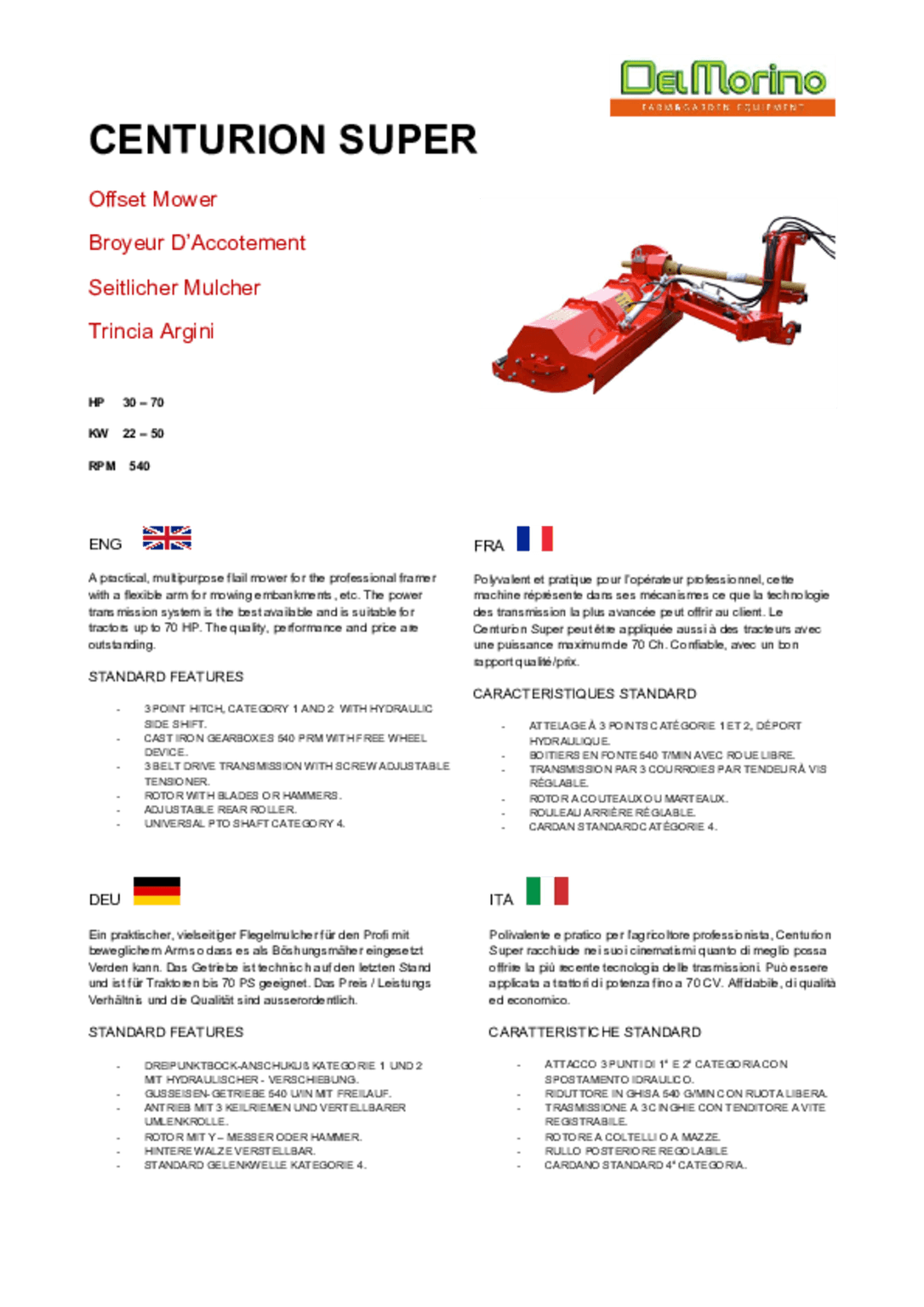CENTURION SUPER 158. Pour tracteur de 30 à 70 cv. Largeur : 158 cm. 3 courroies de transmission ventilées par tendeur à vis réglables. Equipement standard: Attelage à 3 points catégorie 1 et 2 - Boitier en fonte 540 tr/min avec roue libre. Rotor avec 24 marteaux - déport hydraulique. Hauteur de coupe : rouleau arriére réglable 3 positions. Ejection arrière. Cardan catégorie 4. Poids 372 kg. Garantie 2 ans.