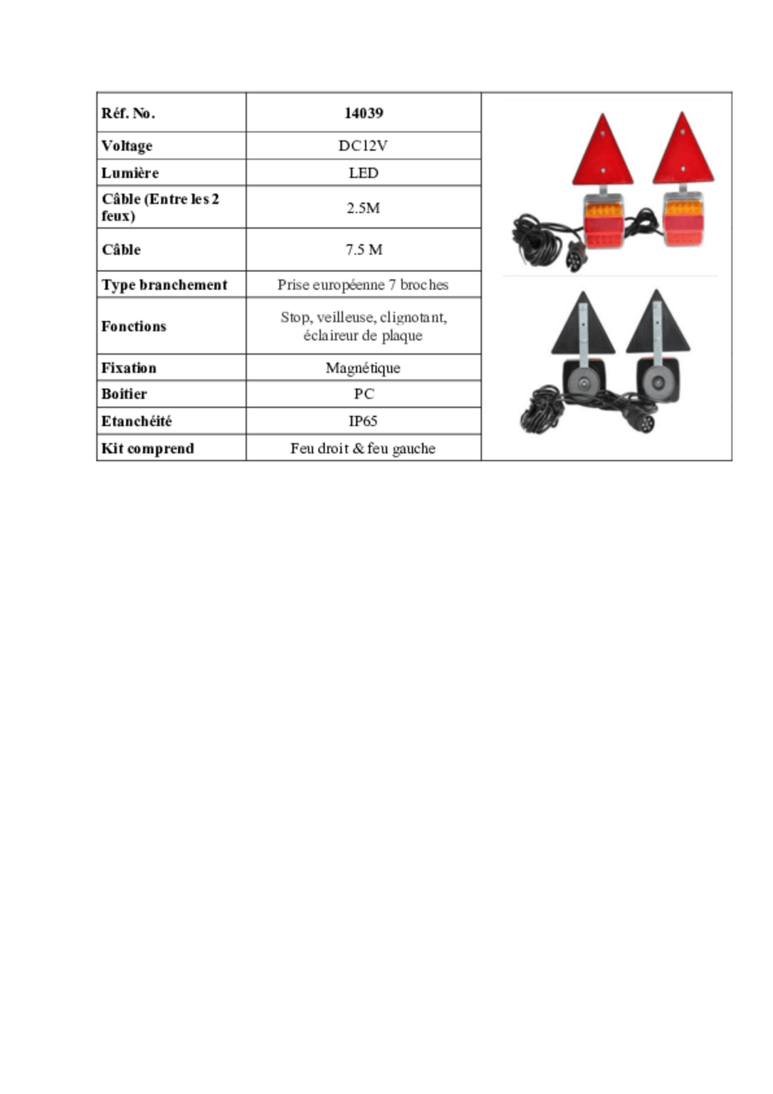 Triangle réfléchissant. 12 V. 2,5 m entre les 2 feux. Câble : 7,5 m. Aimant au dos.