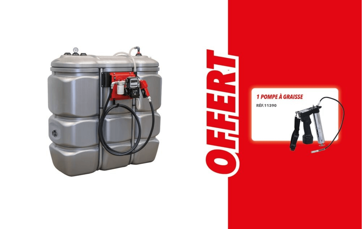 PEHD 1500L double paroi avec station à gasoil 230 V, 60 L/min et pistolet automatique/compteur/filtre.